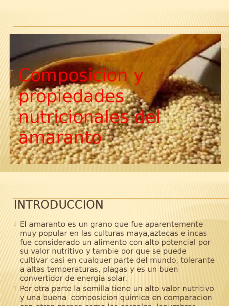 Evaluation of the nutritional contribution of amaranto amaranthus caudatus linnaeus quinua chenopodium quinoa willd and tarwi lupinus mutabilis sweet at breakfast. Los nutrientes del amaranto han contribuido a que se considere uno de los 36 vegetales que tienen mayor potencial desde el punto de vista alimenticio ya que es rico en minerales y proteínasConstituye una fuente excelente de aminoácidos por lo cual se recomienda para incrementar el consumo de proteínas de origen vegetal. El amaranto aporta proteína. El Amaranto alimento tradicional puede consumirse sin reventar. Grano de amaranto cocido. Por otro lado se recomienda su consumo combinado con otros alimentos de gran potencial nutritivo como legumbres y otros cereales puesto que su aporte nutricional se duplica. 100 gramos de Grano de amaranto contiene 653 gramos de carbohidratos 67 gramos de fibra 1356 gramos de proteína 4 miligramos de sodio y 1129 gramos de agua.